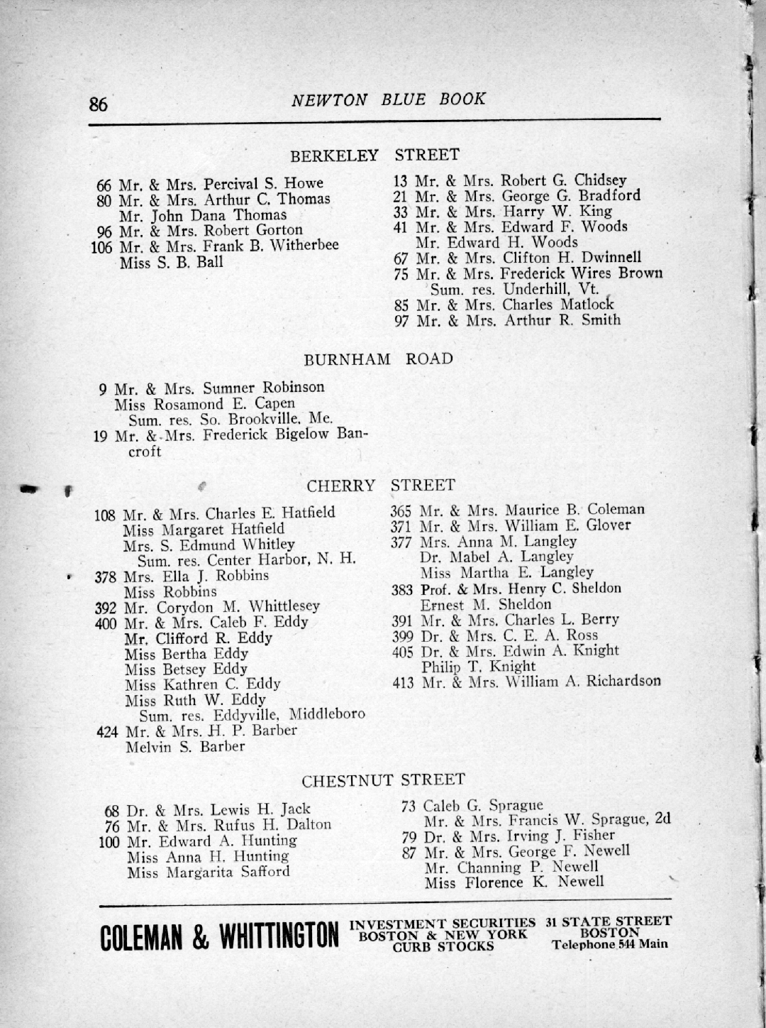 Blue Book for Newton is both a genealogical aid and a document of a way of life that for the most part has vanished. That statement is based on the caption on the Title page that tells us that the book contains a "List of the Leading Residents, Societies, Clubs, Etc." One senses that there is some social selectivity implied, and the listing of clubs tends to corroborate this notion. We have compiled a list of