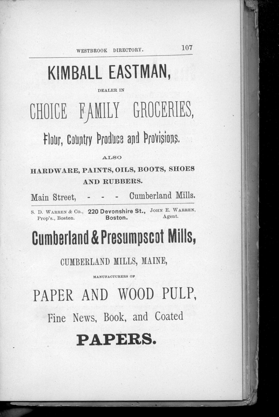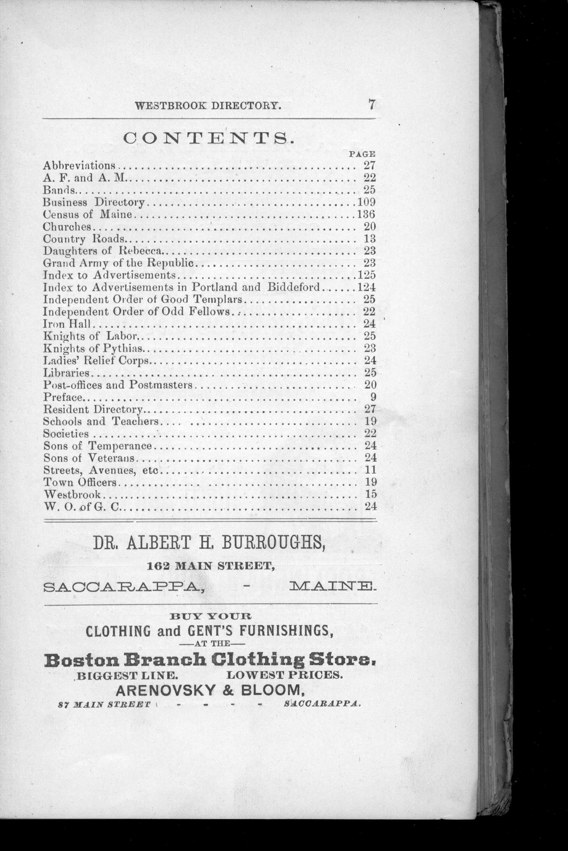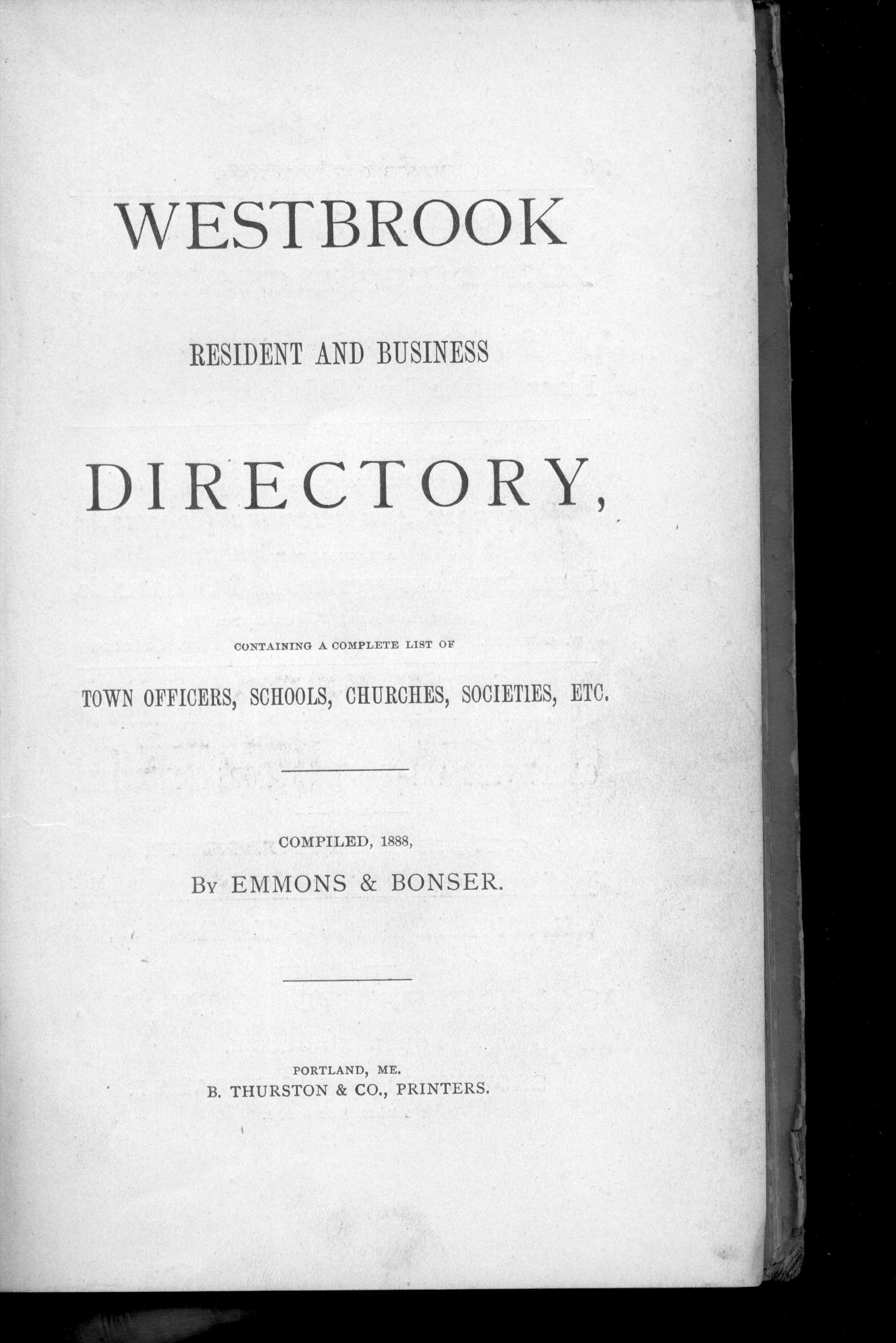 We are pleased to additional historical reference material pertaining to Maine. This volume is the: Westbrook, Maine: Resident and Business Directory for 1888.We believe that anyone interested in the history of Westbrook or the genealogy of any family that lives or lived in the Westbrook area will find this directory essential. When the Westbrook Resident and Business Directory for 1888, by Emmons & Bonser was originally published, it was clear that the once rural Town of Westbrook had become centered in an industrial hub -- known as Saccarappa -- and a secondary hub -- Cumberland Mills. Residents by 1888 were concentrated in these two locales. Indeed, there seem to be two of everything! Lodges, libraries, you name it; there are two of them. It is also evident from this book that Westbrook has been historically tied to Portland itself, not just geographically, but in terms of suppliers and merchants of many kinds. In fact, the "Index to Patrons" in the back of the volume lists as many patrons (i.e. advertisers) in Portland and Biddeford as it does in Saccarappa. The Directory contains what directories of that time typically contained -- and what today is critical information for local and family historians and genealogists: numerous ads, a business directory, locations of streets and roads, a residential directory providing names of heads of households as well as occupation and address, schools, churches, libraries, associations, and the rest.