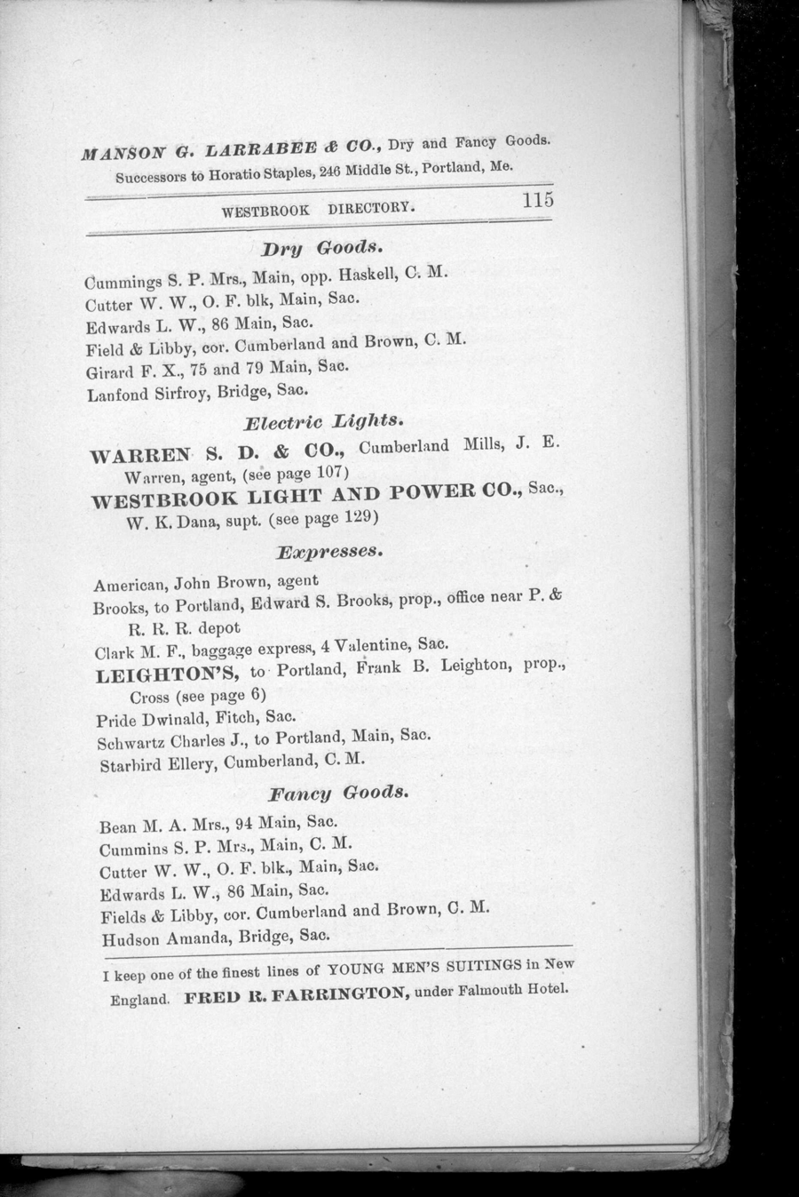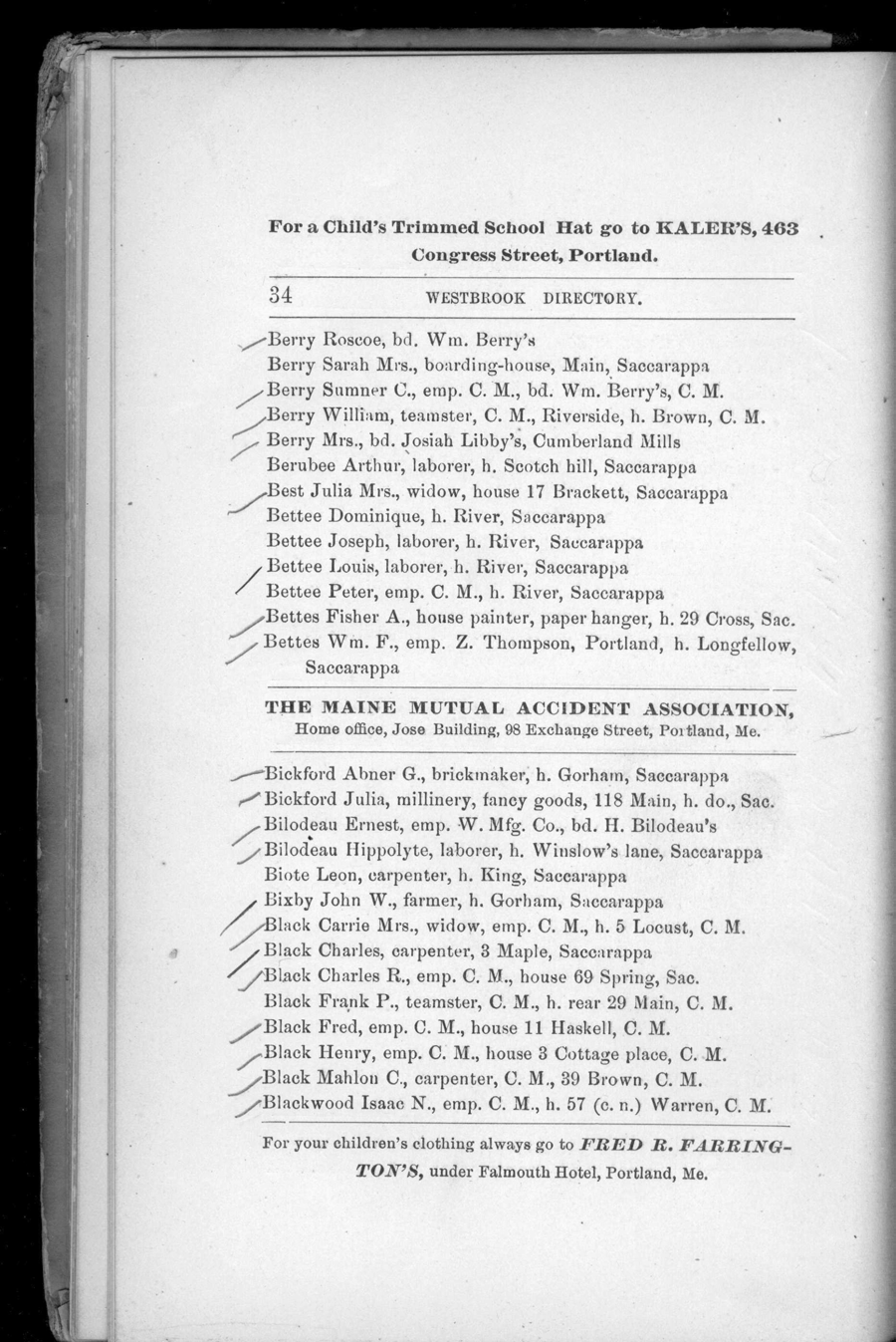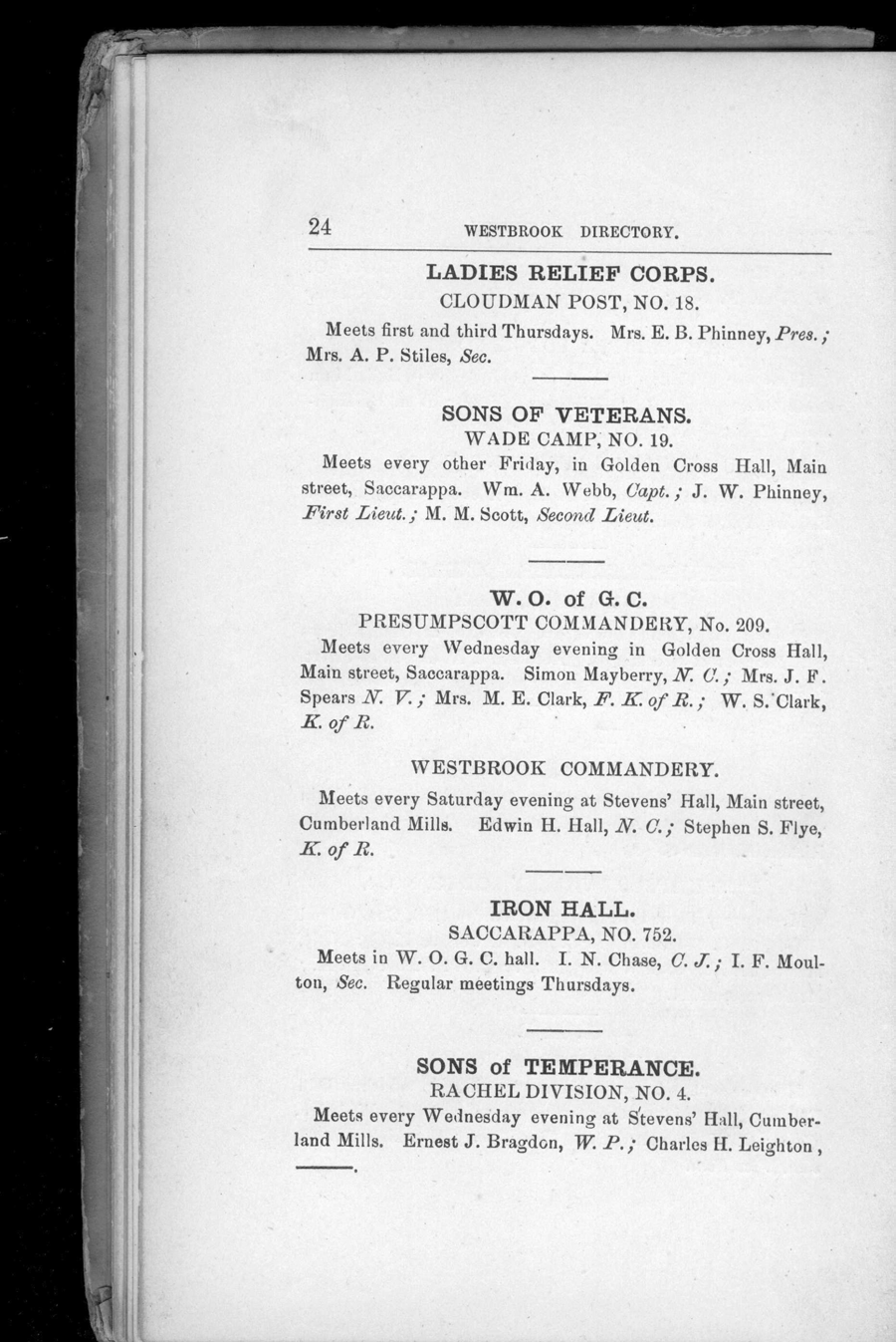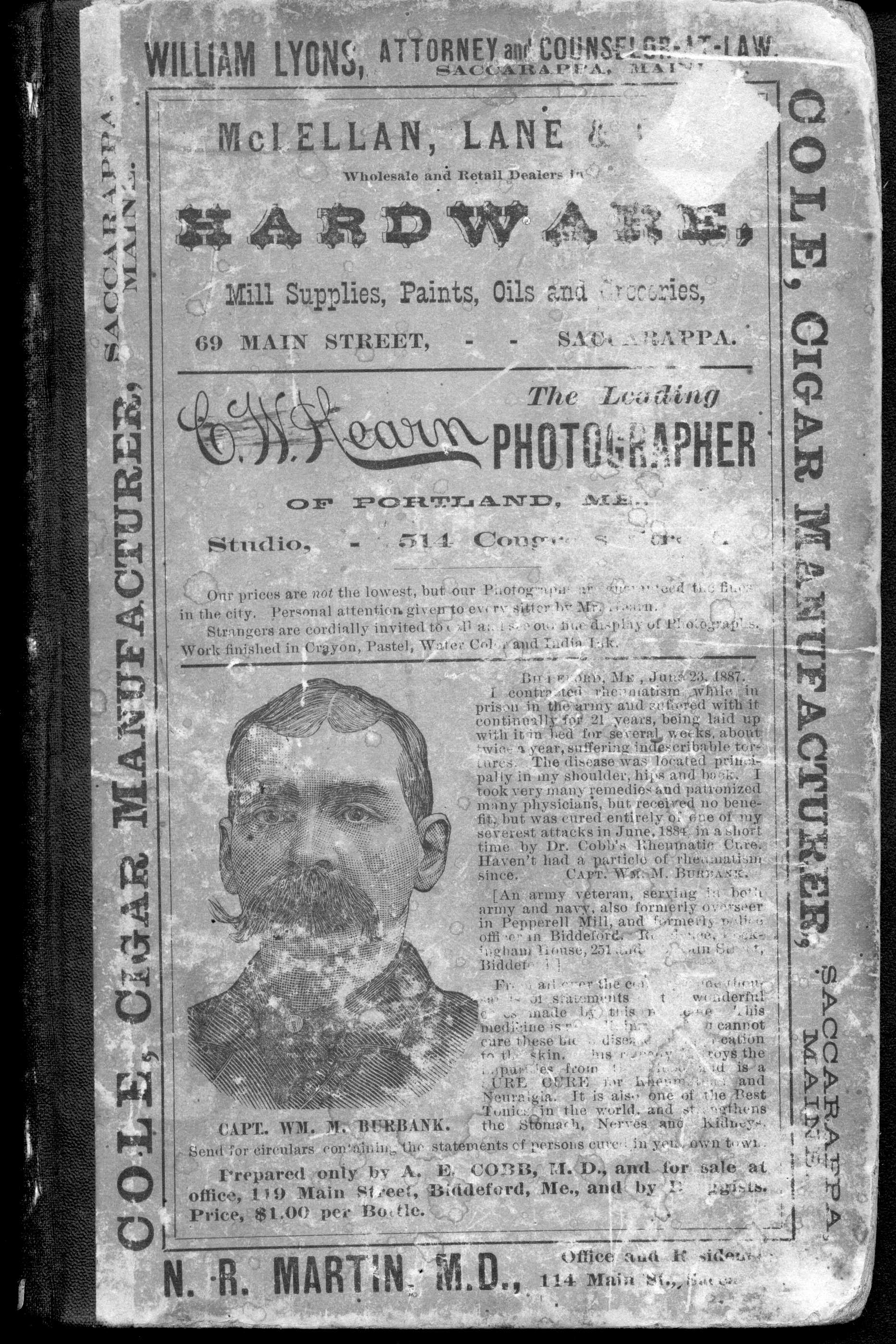 We are pleased to additional historical reference material pertaining to Maine. This volume is the: Westbrook, Maine: Resident and Business Directory for 1888.We believe that anyone interested in the history of Westbrook or the genealogy of any family that lives or lived in the Westbrook area will find this directory essential. When the Westbrook Resident and Business Directory for 1888, by Emmons & Bonser was originally published, it was clear that the once rural Town of Westbrook had become centered in an industrial hub -- known as Saccarappa -- and a secondary hub -- Cumberland Mills. Residents by 1888 were concentrated in these two locales. Indeed, there seem to be two of everything! Lodges, libraries, you name it; there are two of them. It is also evident from this book that Westbrook has been historically tied to Portland itself, not just geographically, but in terms of suppliers and merchants of many kinds. In fact, the "Index to Patrons" in the back of the volume lists as many patrons (i.e. advertisers) in Portland and Biddeford as it does in Saccarappa. The Directory contains what directories of that time typically contained -- and what today is critical information for local and family historians and genealogists: numerous ads, a business directory, locations of streets and roads, a residential directory providing names of heads of households as well as occupation and address, schools, churches, libraries, associations, and the rest.