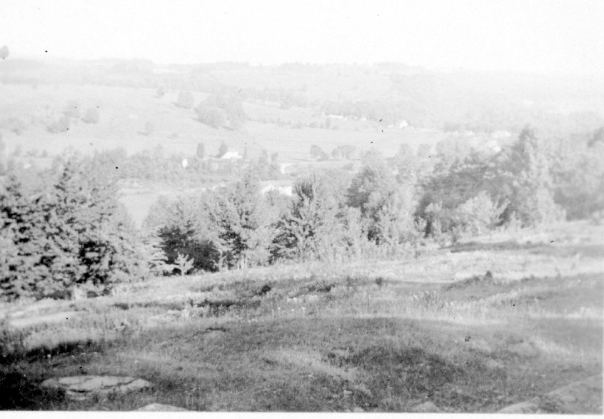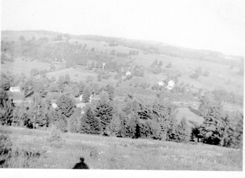 A view of Neversink, probably from the 1920s, from the finger of land that today extends south into the reservoir. The river at this point is flowing right to left, and the site of the future dam is intuitively obvious if one looks near the top of the picture, where the valley narrows. Shown are the Iron Bridge, the Methodist Church, and many of the houses and store that made up Old Neversink. |
